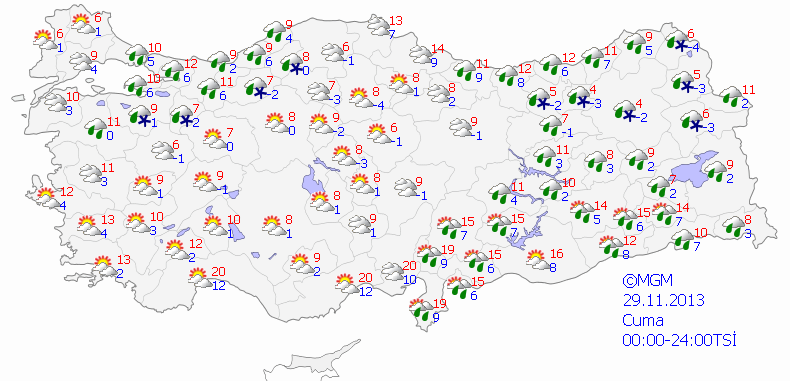 Yapılan son değerlendirmelere göre; Marmara, Ege, Akdeniz, İç Anadolu, Batı Karadeniz, Orta Karadeniz, Doğu Anadolu'nun batısı ile Gümüşhane, Bayburt, Erzurum, Bingöl, Muş, Bitlis, Diyarbakır, Adıyaman, Gaziantep ve Kilis çevrelerinin sağanak ve yer yer gök gürültülü sağanak yağışlı, diğer yerlerin parçalı ve çok bulutlu geçeceği tahmin ediliyor. Yağışların İstanbul, Kocaeli, Sakarya, Bilecik, Bursa, Balıkesir, Yalova, İzmir, Aydın, Isparta'nın güney çevreleri ve Burdur'un doğu ilçelerinde kuvvetli (21-50 kg/metrekare), Muğla ve Antalya çevrelerinde çok kuvvetli ve şiddetli (50-100 kg/metrekare), yer yer aşırı (100 kg/metrekare üzeri) olması bekleniyor.