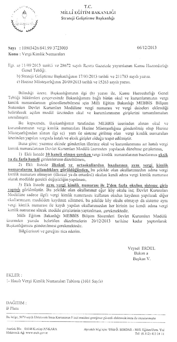 Milli Eğitim Bakanlığı Strateji Geliştirme Başkanlığı 06/12/2013 tarih ve 3723003 sayılı yazıları ile okul ve kurumların vergi kimlik numaralarını düzeltmesini istedi.