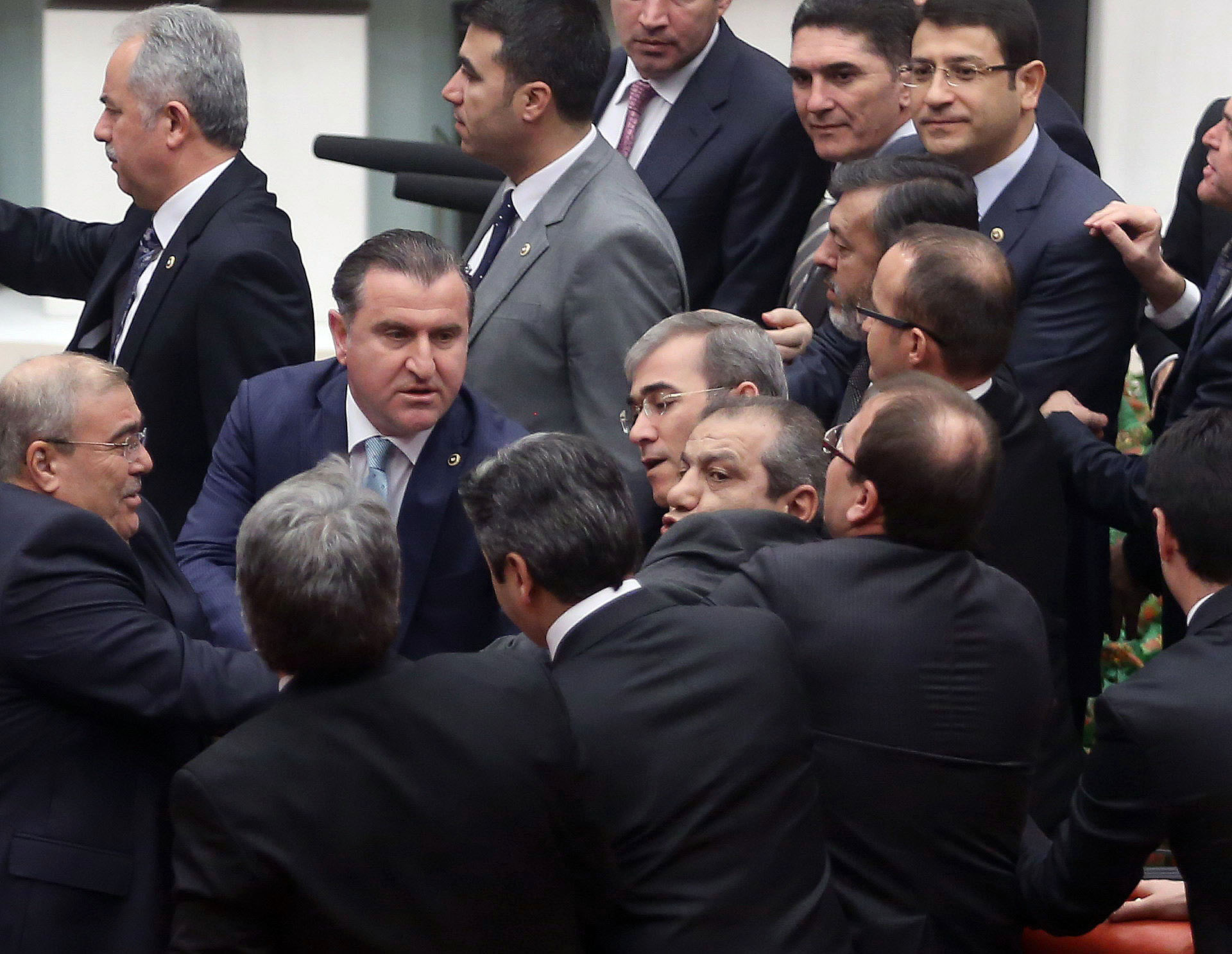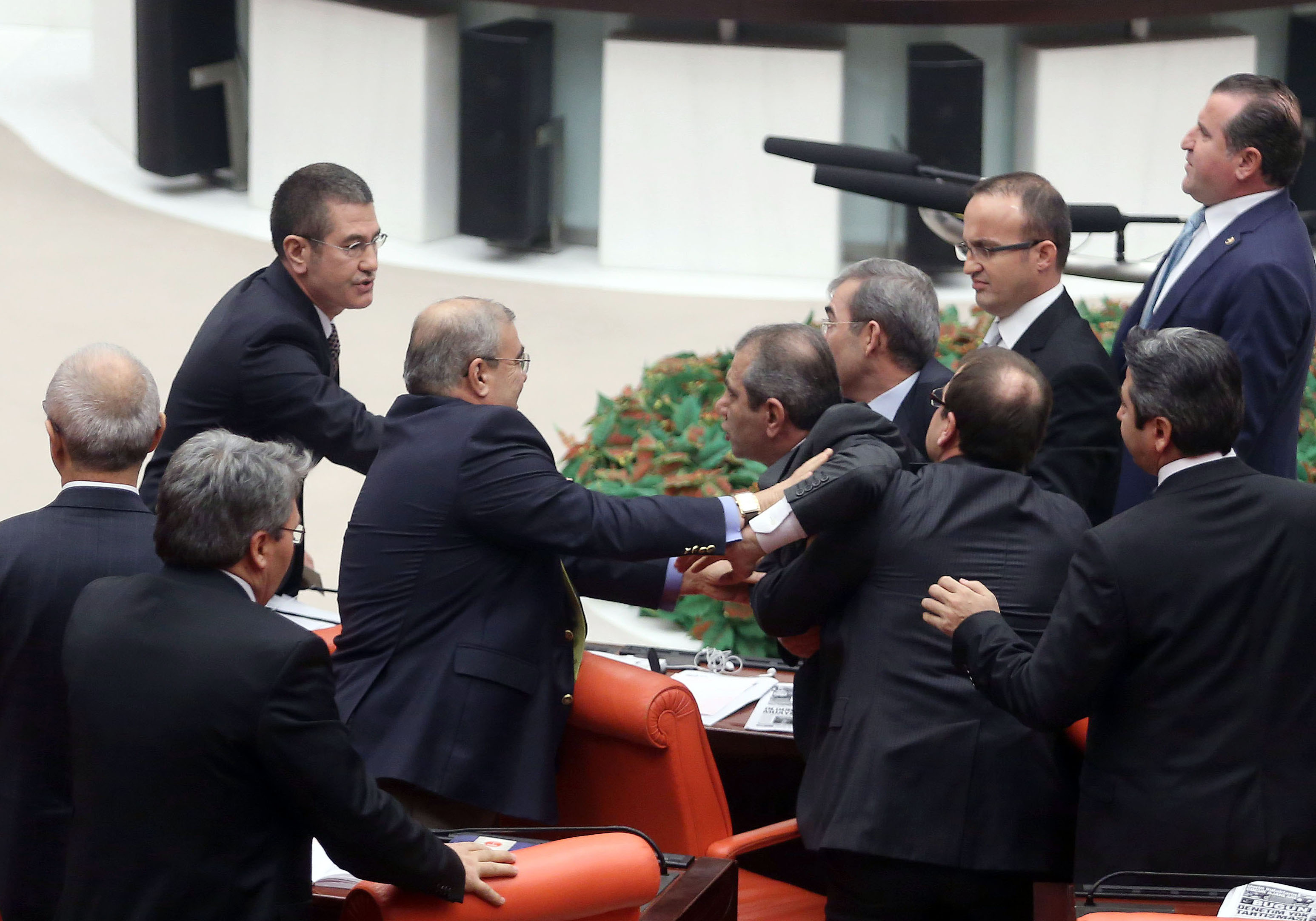 Aslan, İnce'nin küfür ettiği iddasıyla üzerine yürüdü. İktidar milletvekilleri tutmakta güçlük çektiği Aslan'ın önüne Konya milletvekili Hüseyin Üzülmez geçti.