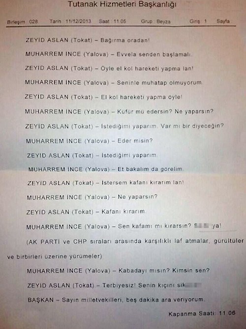 İnce'nin, Başbakan Tayyip Erdoğan'ın CHP'lilere yönelik "terbiyesiz herifler" sözüne tepkisini dile getirdiği konuşmasının ardından yaşanan küfür skandalı Meclis tutanaklarına şöyle yansıdı: