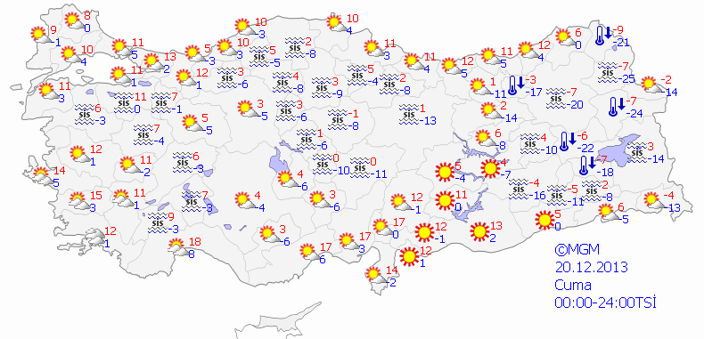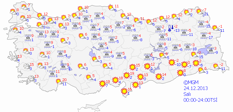 Yapılan son değerlendirmelere göre; Ülkemiz genelinde yağış beklenmiyor. Marmara ile ülkemizin iç ve doğu kesimlerinde buzlanma ve don olayı ile birlikte yer yer sis ve pus hadisesi bekleniyor.