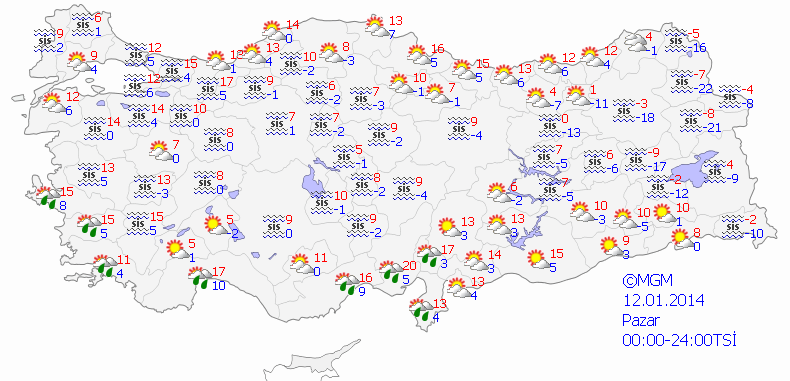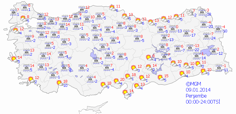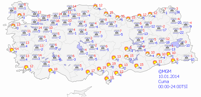 BUZLANMA VE DON OLAYI İLE BİRLİKTE SİS UYARISI: Ülkemizin kuzey, iç ve doğusunda yer yer yoğun olmak üzere sis ve pus hadisesi ile birlikte buzlanma ve don olayının görülmesi beklendiğinden meydana gelebilecek olumsuzluklara karşı (ulaşımda aksamalar, buzlanma vb.) dikkatli ve tedbirli olunması gerekmektedir.