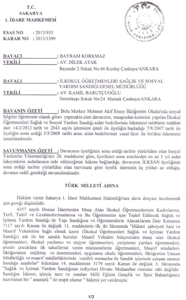 Memur, sandık aidatlarının ödenmesini talep etmiş, bu talebi 14/2/2012 tarihinde reddedilmiştir. Bu red işleminin iptali için de dava açılmıştır.