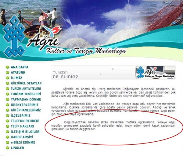 Gümrük Ve Ticaret Bakanlığı'nın bir çok yöntemle mücadele etmeye çalıştığı kaçak çayın devletin bir kurumu tarafından vatandaşlara tavsiye edilmesi dikkat çekti. Ağrı Kültür ve Turizm Müdürlüğü'nün internet sitesinde, 'Turizm aktiviteleri' ana başlığı altındaki 'Ne alınır' bölümünde, kente gelecek turistlerin mutlaka Doğubayazıt'taki halı - kilim satıcılarına da uğraması gerektiği belirtilerek şu ifadeler kullanıldı: