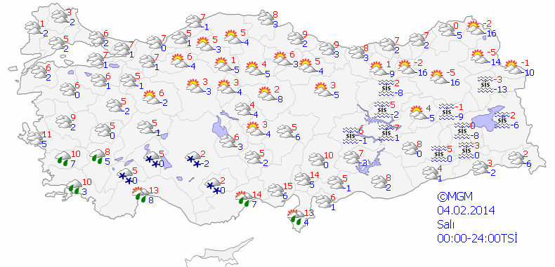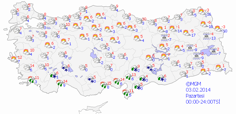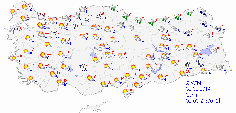 Yapılan son değerlendirmelere göre; Orta ve Doğu Karadeniz kıyıları, Doğu Anadolu'nun kuzeydoğusu ile Sinop ve Artvin çevrelerinin yağışlı geçeceği tahmin ediliyor. Yağışların; Orta ve Doğu Karadeniz kıyıları ile Sinop çevrelerinde yağmur, yağış alan diğer yerlerde kar şeklinde olması bekleniyor. Sabah ve gece saatlerinde Trakya ile iç ve doğu bölgelerde buzlanma ve don olayı görüleceği tahmin ediliyor.