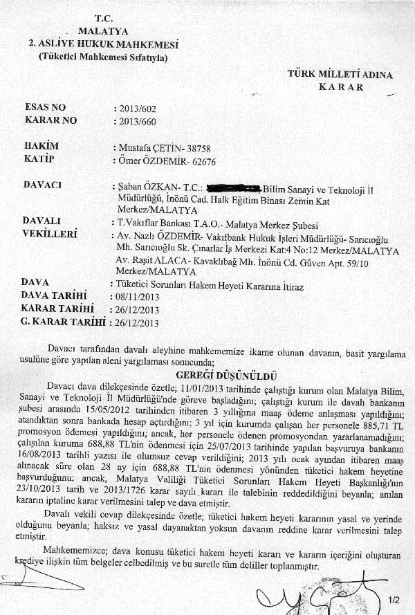 Memur, Tüketici Sorunları Hakem Heyetine başvurmuş ancak talebi reddedilmiştir. Memur, karara itiraz etmiştir. İtirazı görüşen 2. Asliye Hukuk Mahkemesi promosyonun bankaca ödenmesine karar vermiştir.