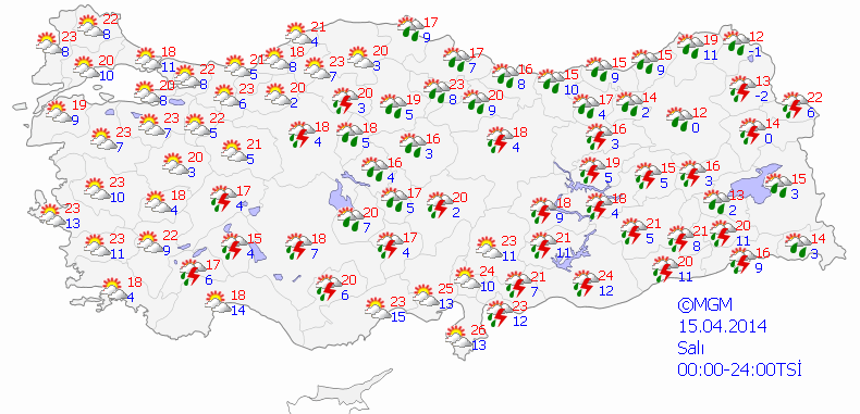 Yapılan son değerlendirmelere göre; Orta Karadeniz kıyıları, Doğu Karadeniz, Doğu Anadolu, Güneydoğu Anadolu'nun kuzey ve doğusu ile Edirne, Kırklareli, Tekirdağ, Sinop ve Sivas çevrelerinin yağmur ve sağanak yer yer gök gürültülü sağanak yağışlı geçeceği tahmin ediliyor. Yağışların; sabah saatlerinde Elazığ, Bingöl, Şanlıurfa, Diyarbakır, öğle saatlerinde Bingöl ve Muş çevrelerinde yerel olarak kuvvetli olması bekleniyor.