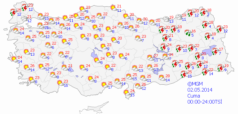 Meteoroloji'den yapılan son değerlendirmelere göre; Marmara, Ege, Batı Akdeniz, İç Anadolu'nun kuzey ve doğusu, Karadeniz, Doğu Anadolu'nun kuzeyi, Güneydoğu Anadolu'nun doğusu ile Bitlis, Muş, Şırnak ve Hakkari çevrelerinin sağanak ve yer yer gök gürültülü sağanak yağışlı geçeceği tahmin ediliyor. Yağışların; sabah saatlerinde Antalya'nın kuzey, Isparta'nın güney ilçelerinde, öğleden sonra Kıyı Ege, Çanakkale, Kocaeli, Sakarya, Bursa, Aydın, Manisa, Düzce, Karabük ve Bolu çevrelerinde yerel olarak kuvvetli olması bekleniyor.