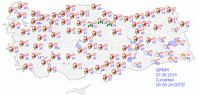 Meteoroloji'den yapılan son değerlendirmelere göre: Ülkemizin büyük bir bölümünde sağanak ve gök gürültülü sağanak şeklinde görülecek yağışların; Marmara, İç Ege, Batı Akdeniz, Doğu Akdeniz'in doğusu, Batı Karadeniz, Doğu ve Güneydoğu Anadolu'nun batısı, Eskişehir, Çankırı, Kırıkkale, Kırşehir, Yozgat, Çorum, Amasya ile Ankara'nın kuzey ve batı çevrelerinde yerel olarak kuvvetli olacağı tahmin ediliyor.