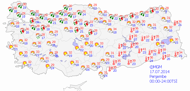 RÜZGAR :Genellikle kuzey, Akdeniz kıyıları ile güneydoğu kesimlerde güney ve güneybatı yönlerden hafif ara sıra orta kuvvette, Güney Ege kıyıları ile akşam saatlerinden sonra Marmara ile Batı Karadeniz kıyılarında yer yer kuvvetli olarak (30-50 km/saat) eseceği tahmin ediliyor.