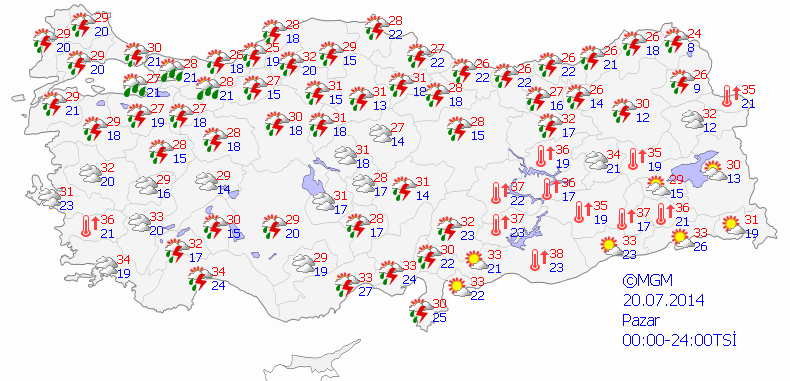 Yapılan son değerlendirmelere göre: Ülkemizin kuzey ve batı kesimleri ile Doğu Akdeniz'in parçalı yer yer çok bulutlu, Marmara, Batı Karadeniz, Batı Akdeniz'in iç kesimleri, Doğu Karadeniz kıyıları ile Denizli, Afyon, Çorum, Ankara, Çankırı, Kırşehir, Kırıkkale, Konya, Artvin, Osmaniye, Hatay ve Adana'nın kuzey ve doğu kesimlerinin sağanak ve yer yer gök gürültülü sağanak yağışlı geçeceği tahmin ediliyor.