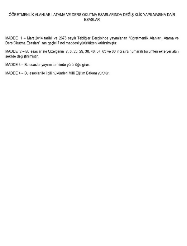 Beden Eğitimi, Bilişim Teknolojileri,Gazetecilik, Görsel Sanatlar,İmam- Hatip Lisesi Meslek Dersleri, Konaklama ve Seyahat Hizmetleri, Muhasebe ve Finansman, Pazarlama ve Perakende, Radyo-Televizyon Öğretmenlik Alanlarının Atama ve Ders Okutma Esasları Çizelgeleri değiştirildi.