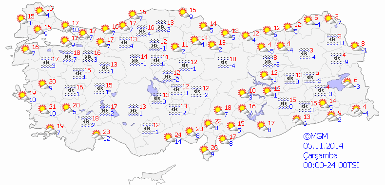 Meteoroloji'den yapılan son değerlendirmelere göre: Ülkemizin kuzey ve doğu kesimleri parçalı ve çok bulutlu, Orta ve Doğu Karadeniz kıyıları ile Sinop, Artvin, Ardahan, Van, Hakkari ve Şırnak çevrelerinin yağışlı, diğer yerlerin parçalı ve az bulutlu geçeceği tahmin ediliyor. Yağışların; Orta ve Doğu Karadeniz kıyılarında yağmur ve sağanak, Artvin'in iç kesimleri, Ardahan, Van, Hakkari ve Şırnak çevrelerinde karla karışık yağmur ve kar şeklinde olması bekleniyor. Bu sabah ve gece saatlerinde Marmara'nın doğusu ile iç kesimlerde yer yer pus ve sis hadisesi bekleniyor.