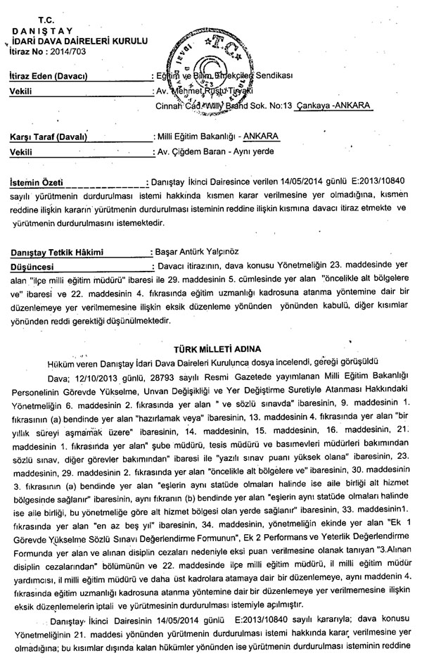Danıştay İDDK, Eğitim-Sen'in açtığı davada, 23.10.2014 gün ve İtiraz No: 2014/703 sayılı kararıyla Yönetmeliğin 23. maddesinde yer alan "ilçe milli eğitim müdürü" ibaresinin yürütmesini durdurmuştur. Buna göre ilçe milli eğitim müdürlüklerine atanma da görevde yükselme kapsamına alınacaktır.
