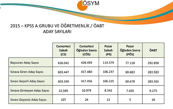 4-5 Temmuz 2015 tarihlerinde yapılan 2015-KPSS A Grubu ve Öğretmenlik Sınavı (13 test, 500 soru) ile 12 Temmuz 2015 tarihinde yapılan 2015 Öğretmenlik Alan Bilgisi Testi (16 alan, 800 soru) değerlendirme işlemleri tamamlanmıştır.