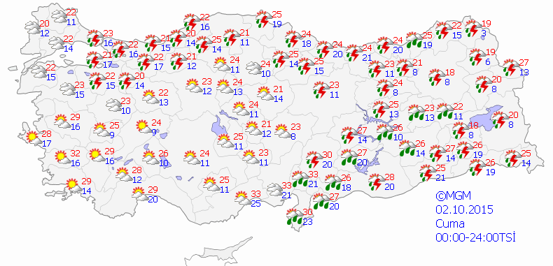 Meteoroloji'den yapılan son değerlendirmelere göre; Marmara'nın doğusu, Batı ve Orta Karadeniz, Doğu Karadeniz kıyıları, İç Anadolu'nun güney ve doğusu, Göller Yöresi, Doğu ve Güneydoğu Anadolu'nun batısı ile Ankara, Çankırı, Osmaniye, Hatay, K.Maraş, Ağrı, Van ve Hakkari çevrelerinin sağanak ve yer yer gök gürültülü sağanak yağışlı geçeceği tahmin ediliyor. Yağışların; Sakarya, Düzce, Zonguldak, Bartın, Rize çevreleri ile Kastamonu ve Artvin'in kıyıları, Trabzon ve Kocaeli'nin doğu kesimlerinde yerel olarak kuvvetli (21-) olması bekleniyor.
