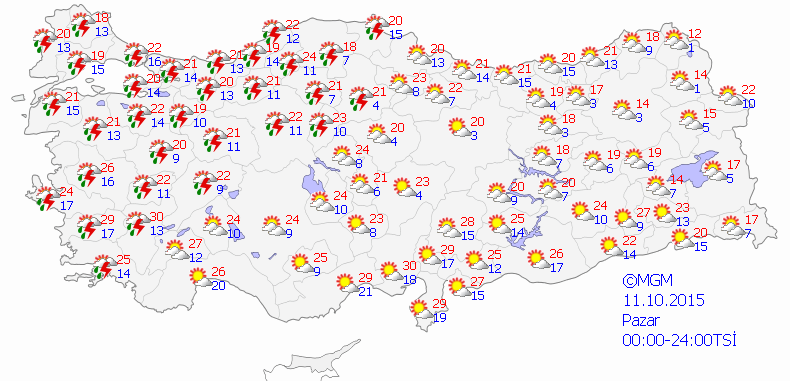 Meteoroloji'den yapılan son değerlendirmelere göre; Ülkemizin kuzey, iç ve doğu kesimlerinin parçalı ve çok bulutlu, Doğu Akdeniz, İç Anadolu'nun kuzey ve doğusu, Karadeniz, Doğu Anadolu, Güneydoğu Anadolu, İstanbul, Kocaeli, Sakarya, Bilecik, Yalova, Ankara, Eskişehir ve Çankırı çevreleri ile Kırklareli'nin kıyı kesimlerinin aralıklı sağanak ve gök gürültülü sağanak yağışlı, diğer yerlerin parçalı ve yer yer az bulutlu geçeceği tahmin ediliyor. Yağışların; Orta ve Doğu Karadeniz kıyıları, Adana'nın doğu ilçeleri, Osmaniye, Sinop, Tunceli, Bingöl, Elazığ, Muş, Bitlis, Şırnak, Diyarbakır, Batman, Siirt çevreleri ile Kastamonu ve Hatay'ın kıyı kesimlerinde yerel olmak üzere kuvvetli, Orta ve Doğu Karadeniz kıyıları, Kastamonu'nun kıyı ilçeleri ile Sinop'un batı kıyılarında yer yer çok kuvvetli ve şiddetli olması bekleniyor.Bu sabah saatlerinde Marmara'nın doğusu ile Konya çevrelerinde sis yer yer pus hadisesi beklenmektedir.
