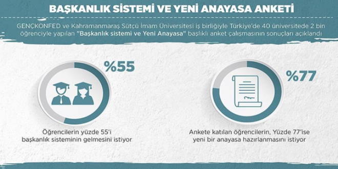 "Ankete 40 üniversiteden 2 bin öğrenci katıldı. Üniversite öğrencilerinin yüzde 55'i mevcut parlamenter sistem yerine başkanlık sisteminin gelmesini destekliyor. Öğrencilerin yüzde 77'si de mevcut anayasanın değişmesini ve yeni bir anayasa hazırlanması gerektiğini düşünüyor."