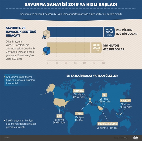 Savunma ve havacılık sektörü bu yılki ihracat performansıyla diğer sektörleri geride bıraktı. Ülke ihracatının yüzde 17 azaldığı bir ortamda, sektörün yılın ilk 2 ayındaki ihracatı geçen yılın aynı dönemine göre yüzde 30 arttı.