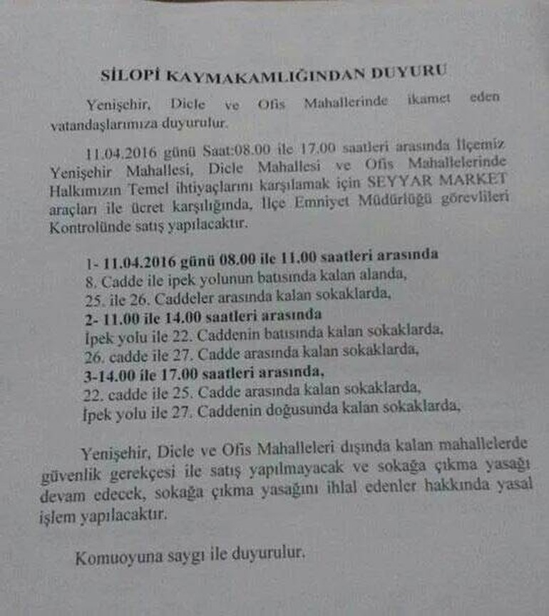 Silopi Kaymakamlığı'ndan ilçenin Yenişehir, Dicle ve Ofis Mahallerinde ikamet eden vatandaşlara yönelik yapılan duyuruda, bugün saat 08.00 ile 17.00 arasında söz konusu 3 mahallede oturan vatandaşların temel ihtiyaçlarını karşılanması için seyyar market araçları ile ilçe emniyet müdürlüğü görevlileri kontrolünde satış yapılacağı belirtildi. Yazılı açıklamada "Yenişehir, Dicle ve Ofis Mahalleri dışında kalan mahallerde güvenlik gerekçesi ile satış yapılmayacak ve sokağa çıkma yasağını ihlal edenler hakkında yasal işlem yapılacaktır" denildi.