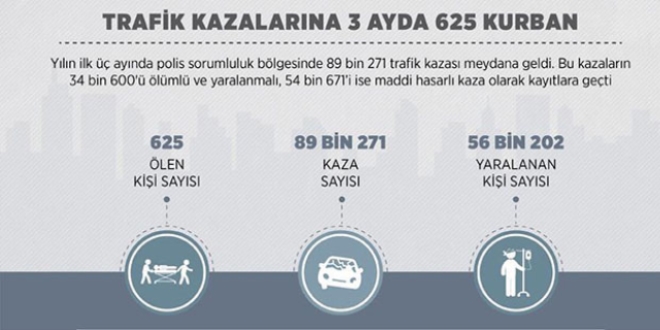 Yılın ilk üç ayında Türkiye genelinde meydana gelen ölümlü ve yaralanmalı 34 bin 600 trafik kazasında 625 kişi hayatını kaybederken, 56 bin 202 kişi de yaralandı.
