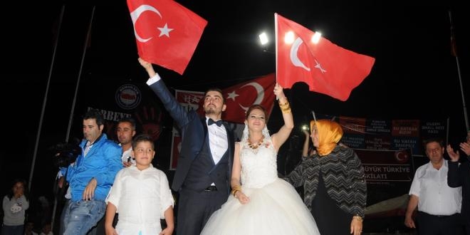 Bartın'da düğünlerini yapan gelin ve damat, Fetullahçı Terör Örgütü'nün (FETÖ) darbe girişiminin ardından başlatılan "demokrasi nöbeti'ne katıldı.