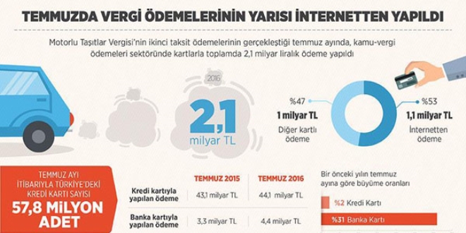 Motorlu Taşıtlar Vergisi'nin (MTV) ikinci taksit ödemesinin yapıldığı temmuz ayında, bu ödemeleri de kapsayan kamu-vergide kredi kartlarıyla 2,1 milyar TL'lik ödeme yapıldı. Söz konusu tutar, kredi kartları ile yapılan ödemelerin yaklaşık yüzde 5'ini oluşturdu.