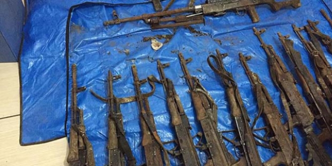 Evde teröristlere ait 12 kalaşnikof, makineli tüfek, 14 el bombası, bu silahlara ait çok sayıda fişek ve şarjör ile gece görüşlü 2 dürbün ve örgütsel döküman ele geçirildi.