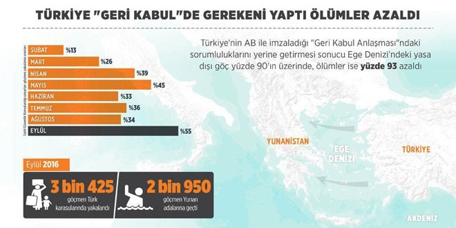 Türkiye, AB ile 18 Mart'ta Brüksel'de yasa dışı göçün önlenmesi, Ege Denizi'nde ölümlerin sona ermesi ve insan kaçakçılarıyla mücadele amacıyla imzaladığı "Geri Kabul Anlaşması" kapsamında bütün sorumluluklarını yerine getirerek denizlerdeki dramların sona ermesi adına önemli bir başarıya imza attı.