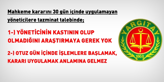 Yargıtay Hukuk Genel Kurulu, mahkeme kararını 30 gün içinde uygulamayan yöneticinin manevi tazminata mahkum edilmesi için kastının olup olmadığının araştırılmasına gerek bulunmadığının, salt mahkeme kararının uygulanmamış olmasının manevi tazminat için yeterli olduğuna karar verdi.