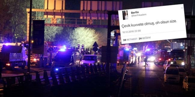 İstanbul Beşiktaş'taki bombalı saldırılar sonrası HDP'li Berfin Kadem alçak bir mesaj paylaşmıştı. Polisleri hedef alan hain saldırı sonrası adeta kutlama yapan Berfin Kadem isimli Twitter kullanıcısı, "Çevik kuvvete olmuş, oh olsun size" şeklinde paylaşımda bulunmuştu.