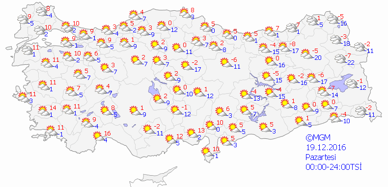 Yapılan son değerlendirmelere göre; Yurdun kuzey ve doğu kesimlerinin parçalı ve çok bulutlu, Marmara'nın güney ve doğusu, Batı Karadeniz, Doğu Anadolu'nun güneydoğusu, Kütahya, Eskişehir, Ağrı ve Iğdır ile sabah saatlerinde Amasya, Batman ve Siirt çevrelerinin yağışlı geçeceği tahmin ediliyor. Yağışların; genellikle karla karışık yağmur ve kar, Çanakkale ve İstanbul çevrelerinde yağmur şeklinde olması bekleniyor. Kuzey, iç ve doğu kesimlerde buzlanma ve don olayı görüleceği tahmin ediliyor.