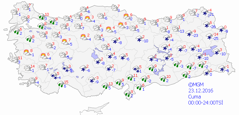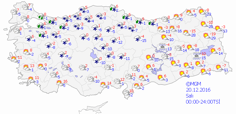 Yapılan son değerlendirmelere göre; ülkemizin doğu kesimlerinin parçalı yer yer çok bulutlu, sabah saatlerinden itibaren Şırnak ve Hakkari çevrelerinin kar yağışlı, diğer yerlerin az bulutlu ve açık geçeceği tahmin ediliyor. Doğu kesimlerde kuvvetli olmak üzere iç kesimlerde buzlanma ve don olayı ile birlikte yer yer sis ve pus hadisesi görüleceği tahmin ediliyor.