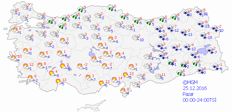 Yapılan son değerlendirmelere göre; Ülkemiz genelinin parçalı ve çok bulutlu, Marmara'nın güney ve doğusu, İç Anadolu'nun güneyi, Batı ve Orta Karadeniz kıyıları, Doğu Karadeniz, Doğu Anadolu'nun kuzey ve doğusu, Güneydoğu Anadolu'nun doğusu ile Antalya, Adana, Mersin ve Hatay çevrelerinin yağışlı geçeceği tahmin ediliyor. Kıyı kesimler ile Mardin çevrelerinde yağmur ve sağanak, yağış alan diğer yerlerde kar şeklinde görülecek yağışların Hakkari çevrelerinde yoğun olması bekleniyor. Doğu kesimlerde kuvvetli olmak üzere iç ve doğu kesimlerde buzlanma ve don olayı ile sabah saatlerinde Marmara'nın doğusu ve Batı Karadeniz'in iç kesimlerinde yer yer pus ve sis hadisesi bekleniyor.