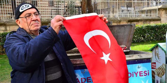 Manisa'nın Şehzadeler ilçesinde bulunan Muradiye Camii önündeki çöp konteynerine, kimliği belirsiz kişi veya kişiler tarafından şeffaf bir poşet içinde çok sayıda bez Türk Türk bayrağı atıldı. Çöpteki bayrakları görenler, tepki gösterdi. Duyarlı birçok kişi çöpteki Türk bayraklarını topladı. Bayrakları toplayanlardan 77 yaşındaki Hüseyin Küçük, namaz çıkışı çöpe atılmış Türk bayraklarını görünce çok üzüldüğünü söyledi. Küçük, bayrakları kimin çöpe attığını bilmediklerini belirtip, "Bayrakları eve götürdükten sonra hediye olarak esnafa dağıtacağım. Bayrağımız kutsaldır" dedi.