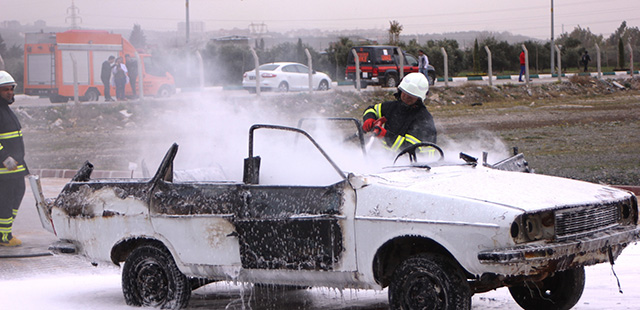Tatbikatın ikinci aşamasında ise itfaiye ekipleri, trafik kazasında alev alan otomobili kısa sürede söndürdü.