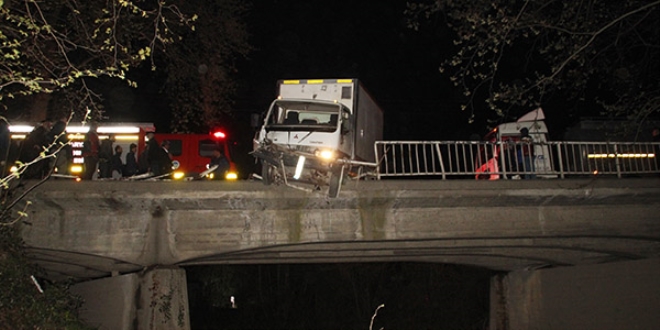Kaza yapan kamyonet köprüde asılı kaldı