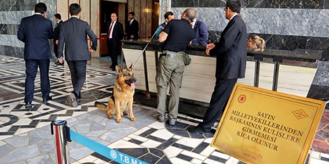 Darbe girişimi sonrasında, güvenlik tedbirleri artırılan Meclis'te bugün iktidar ve muhalefet partilerinin haftalık grup toplantıları öncesinde dedektör köpeği Max, bomba uzmanı polisle birlikte toplantıların yapılacağı salon ve kulisleri tek tek dolaştı. Erken saatlerde başlayan patlayıcı madde araması mesai saatine kadar sürdü.