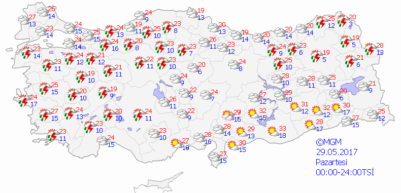 Yapılan son değerlendirmelere göre; Ülkemiz genelinin parçalı ve çok bulutlu, Marmara'nın güneydoğusu, Ege, Akdeniz'in iç kesimleri, İç Anadolu, Karadeniz'in iç kesimleri, Doğu Anadolu'nun kuzey ve batısı ile Edirne, Kırklareli, Sinop, Samsun ve Bingöl çevrelerinin yerel olmak üzere aralıklı sağanak ve yer yer gök gürültülü sağanak yağışlı geçeceği tahmin ediliyor. Yağışların Eskişehir, Ankara, Çankırı, Kırıkkale ve Çorum çevrelerinde yerel olarak kuvvetli olması bekleniyor.
