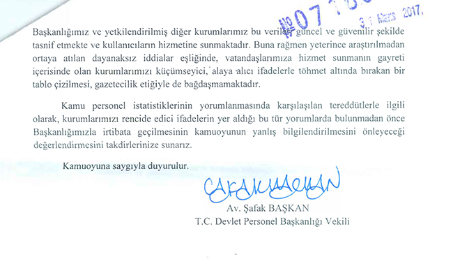 Devlet Personel Başkanlığının gönderdiği cevap ve düzeltme metni