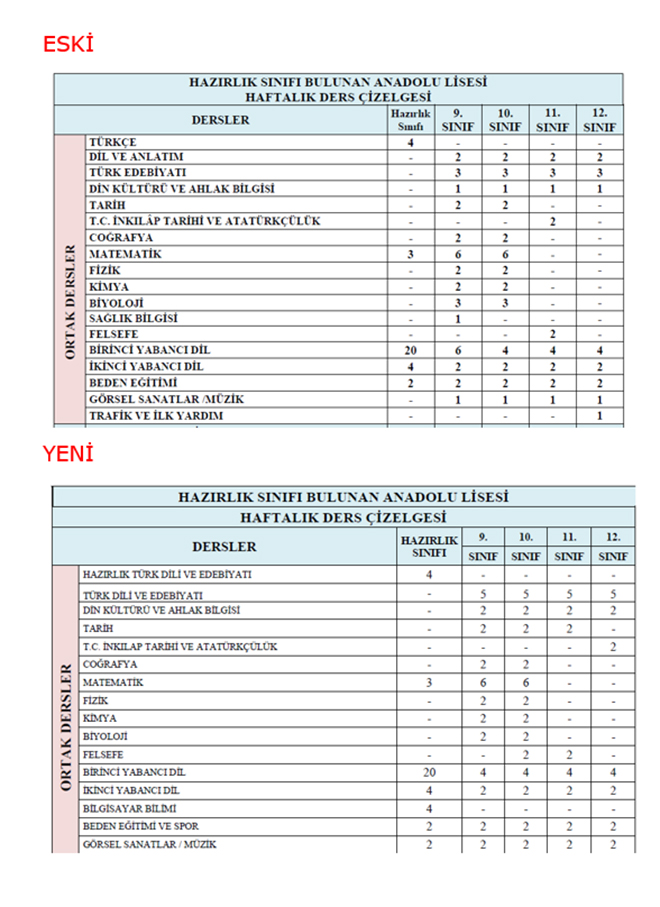 Sadece Anadolu İmam Hatip Liselerinde 9. Sınıfta 1 saatten 2 saate çıkarılmış. Diğer sınıflarda 1 saatte kalmış yani yukarıda TTKB nin açıklamasında geçtiği gibi 9,10,11,12. Sınıfta 2 saate çıkmamış.
