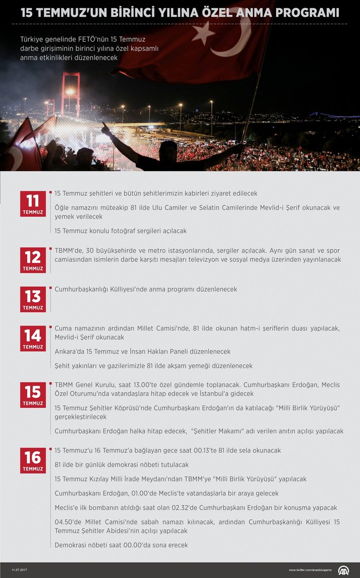 Türkiye genelinde Fetullahçı Terör Örgütü'nün (FETÖ) 15 Temmuz darbe girişiminin birinci yılı nedeniyle kapsamlı anma etkinlikleri düzenlenecek. Cumhurbaşkanı Recep Tayyip Erdoğan'ın çağrısıyla 15 Temmuz gecesi "demokrasi nöbeti" tutulacak, Erdoğan da nöbete katılacak.