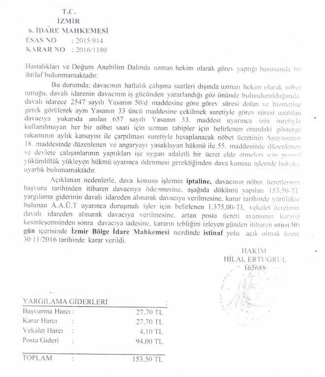 İzmir Bölge Adliye Mahkemesi, yerel mahkeme tarafından verilen "uzman doktorlara nöbet ücreti ödenmesi" kararını onadı