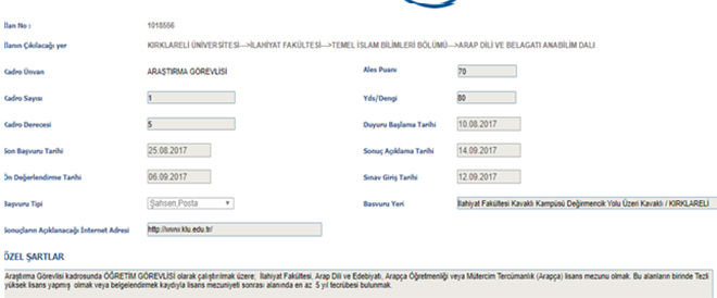 Kırklareli Üniversitesi İlahiyat Fakültesi Temel İslam Bilimleri Arap Dili ve Belagatı Anabilim Dalında istihdam edilmek üzere 3 Araştırma Görevlisi kadrosunu 10 Ağustos 2017 tarihinde Yükseköğretim Kurulu web sayfasında ilan edildi.