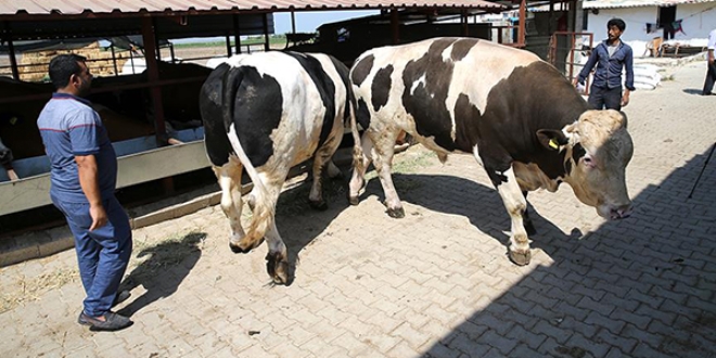 Hatay'ın Reyhanlı ilçesinde besici Mehmet Emin Yumuşak, Kurban Bayramı öncesinde her biri 1,5 tonluk iki boğasını, 30'ar bin liradan satışa çıkardı.