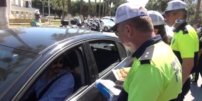 Rize'de trafik denetimi yapan polis ekipleri, sürücülere kitap vererek dikkatli olmaları konusunda uyarılarda bulundu