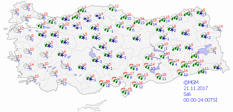Yapılan son değerlendirmelere göre; Ülkemizin güney ve batısı ile zamanla doğu kesimlerinin parçalı yer yer çok bulutlu, Marmara, Kıyı Ege, Batı Akdeniz kıyıları, Doğu Akdeniz, Güneydoğu Anadolu, Doğu Anadolu'nun güney ve batısı ile Manisa çevrelerinin yağmur ve sağanak, Ege ve Akdeniz kıyılarının yer yer gök gürültülü sağanak, Erzurum'un yükseklerinin karla karışık yağmurlu geçeceği tahmin ediliyor.