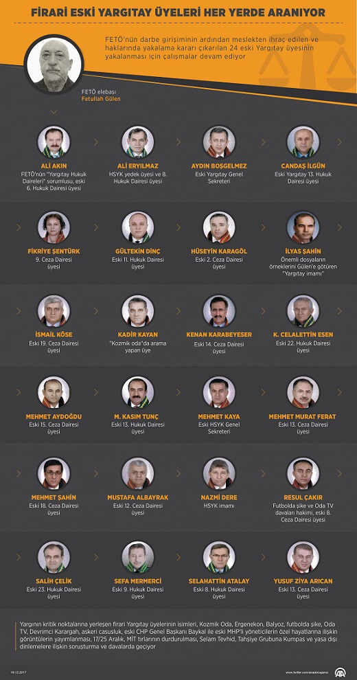 FETÖ'nün darbe girişiminin ardından haklarında yakalama kararı çıkarılan ve meslekten ihraç edilen 24 eski Yargıtay üyesinin yakalanması için çalışmalar devam ediyor. Firari eski yüksek yargı üyeleri arasında sözde "HSYK imamı" olduğu belirtilen Nazmi Dere, "kozmik oda"da arama yapan Kadir Kayan, önemli dosyaların örneklerini bizzat Pensilvanya'daki FETÖ elebaşı Gülen'e götürdüğü bildirilen.