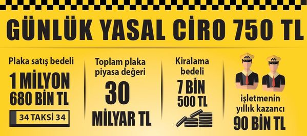 İki vardiya taksi işletildiğinde plaka sahibinin eline hasılattan aylık ortalama 7 bin 500 TL geçiyor. Yılda bu rakam 90 bin TL'yi buluyor. Yani 1.6 milyon TL'lik plaka sahibine giderler hariç yılda en az 90 bin TL bırakıyor. Ortalama yakıt maliyeti 4 bin 500 TL'yi buluyor. Buna, araç sigortası için 500 lira, çalışan taksici sigortası için bin lira ve araç bakımı için de 500 TL eklendiğinde, bir taksiye harcanan tutar ayda 6 bin 500 TL oluyor. Bu hesaba göre, bir taksi şoförünün gelir elde etmesi için aylık cirosunun 14 bin lirayı geçmesi gerekiyor.
