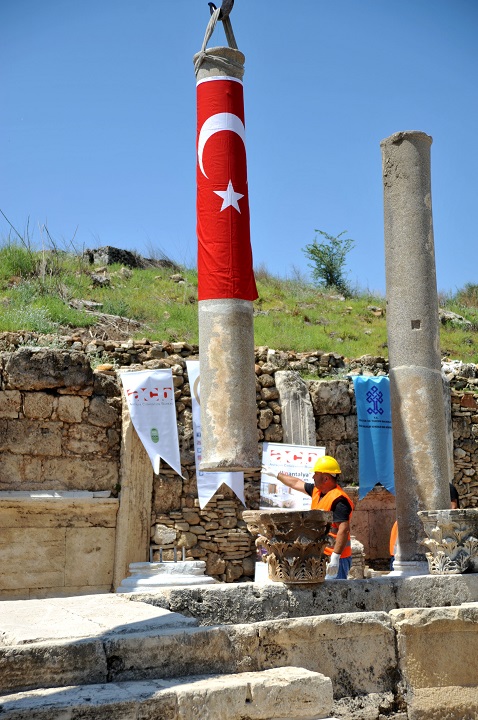 Antalya Valiliğince Aksu ilçesindeki Perge Antik Kenti için başlatılan "Bir Sütunda Sen Dik" kampanyasıyla sütunlar ayağa kaldırılıyor.